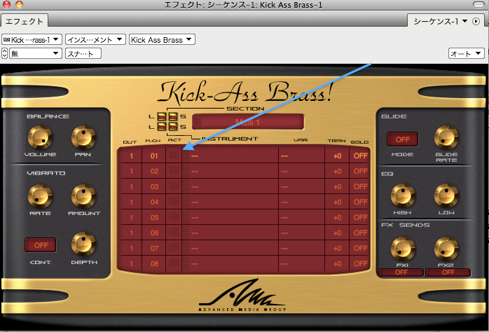 このように1つの楽器(アルトサックスとか)で1つの Kick-Ass Brass!を立ち上げると便利です。そして奏法毎にそれぞれmidiチャンネルを分けています。例えば5つの奏法を使って5つの楽器を使う場合5×5=25個のmidiトラックを使う事になります。よく使う奏法が決まってくれば矢印のところを押してセーブしておくと良いでしょう。