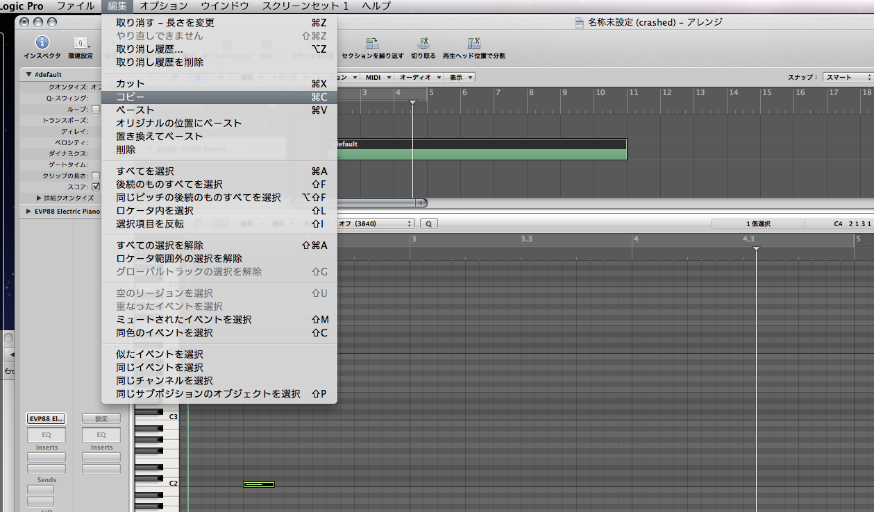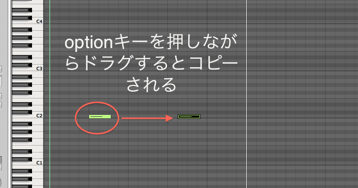 まずピアノロールの中のコピーする対象をクリックし選択します。